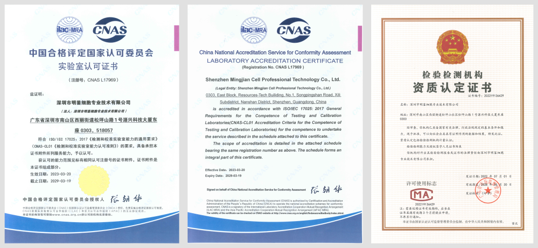 细胞计数和细胞活率是细胞治疗产品生产和放行的重要检测指标。但细胞计数和细胞活率检测的准确性和稳定性一直是困扰行业的难题,我司在本次评审中通过了这两个项目的认证,也是目前大湾区首个获得这两个项目CNAS认证的机构,同时,我司也是大湾区唯一一个具有细胞表面蛋白检测(流式细胞术)、抗生素检测和牛血清白蛋白残留检测等CMA认证项目的机构。