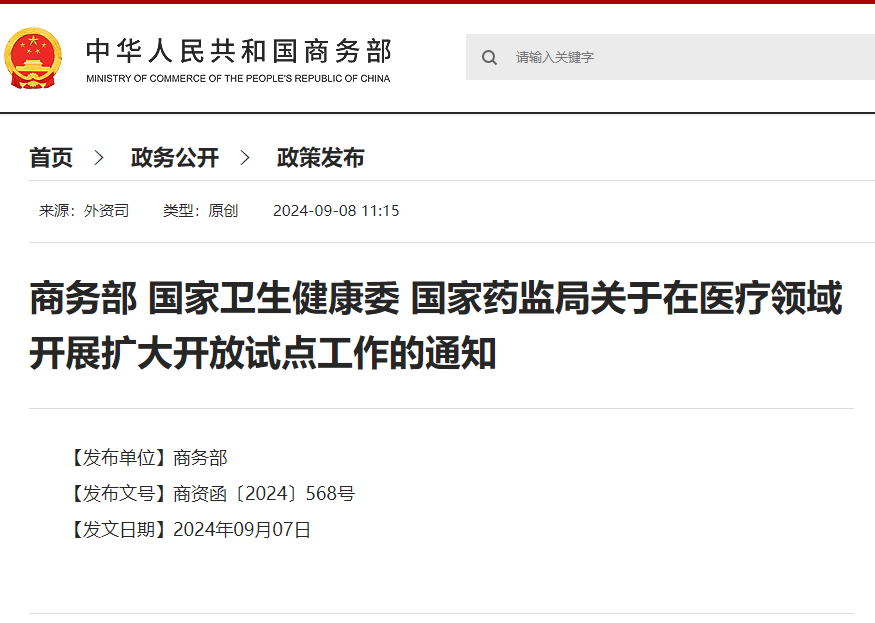 商务部、国家卫生健康委、国家药监局发布关于在医疗领域开展扩大开放试点工作的通知。