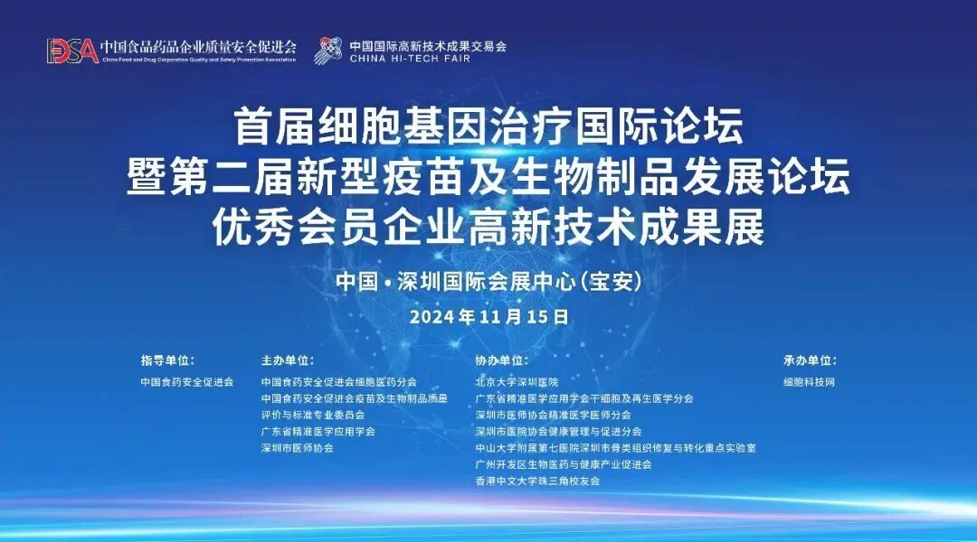 第二十六届中国国际高新技术成果交易会(下称“高交会”)于2024年11月14日-16日在全球最大的会展中心——深圳国际会展中心隆重举行并圆满结束。在高交会的生物医药板块中,由中国食品药品企业质量安全促进会(简称:中国食药安全促进会)细胞医药分会、中国食药安全促进会疫苗及生物制品质量评价与标准专业委员会、广东省精准医学应用学会、深圳市医师协会联合主办的首届细胞基因治疗国际论坛暨第二届新型疫苗及生物制品发展论坛和中国食药安全促进会优秀会员企业高新技术成果展(简称“两会一展”)也如期盛大开幕!