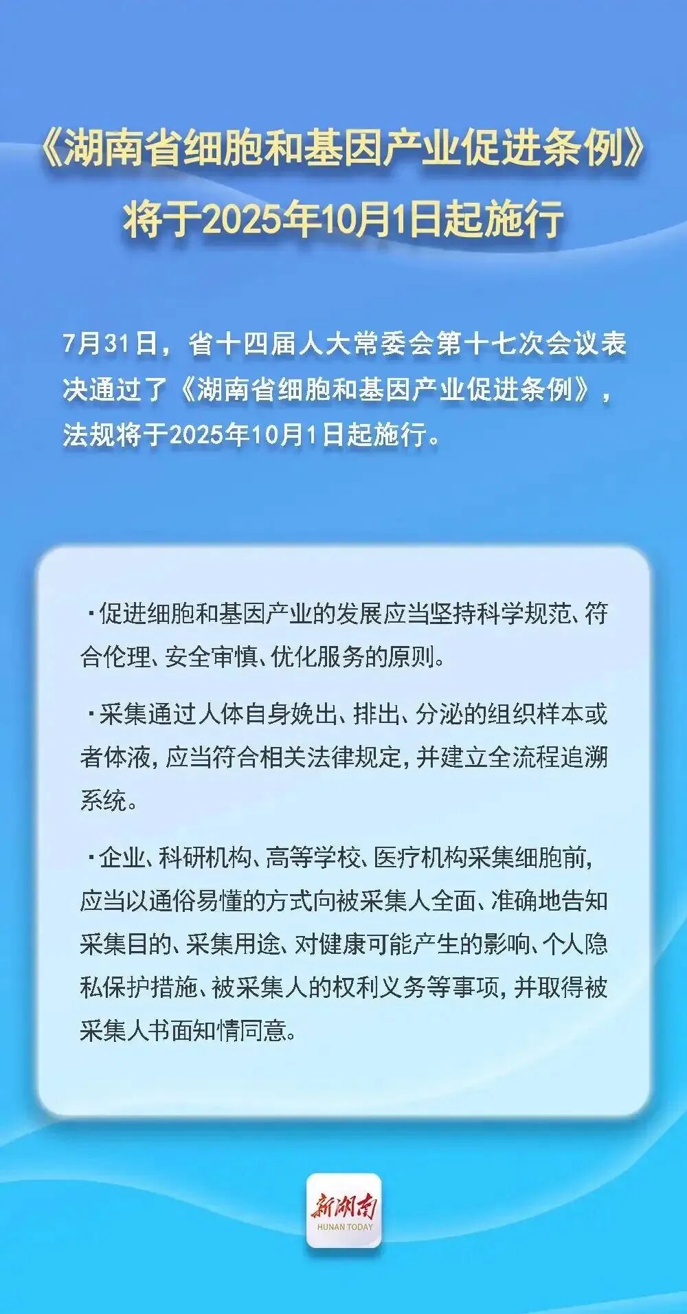 2025年7月31日,省十四届人大常委会第十七次会议表决通过了《湖南省细胞和基因产业促进条例》,法规将于2025年10月1日起施行。