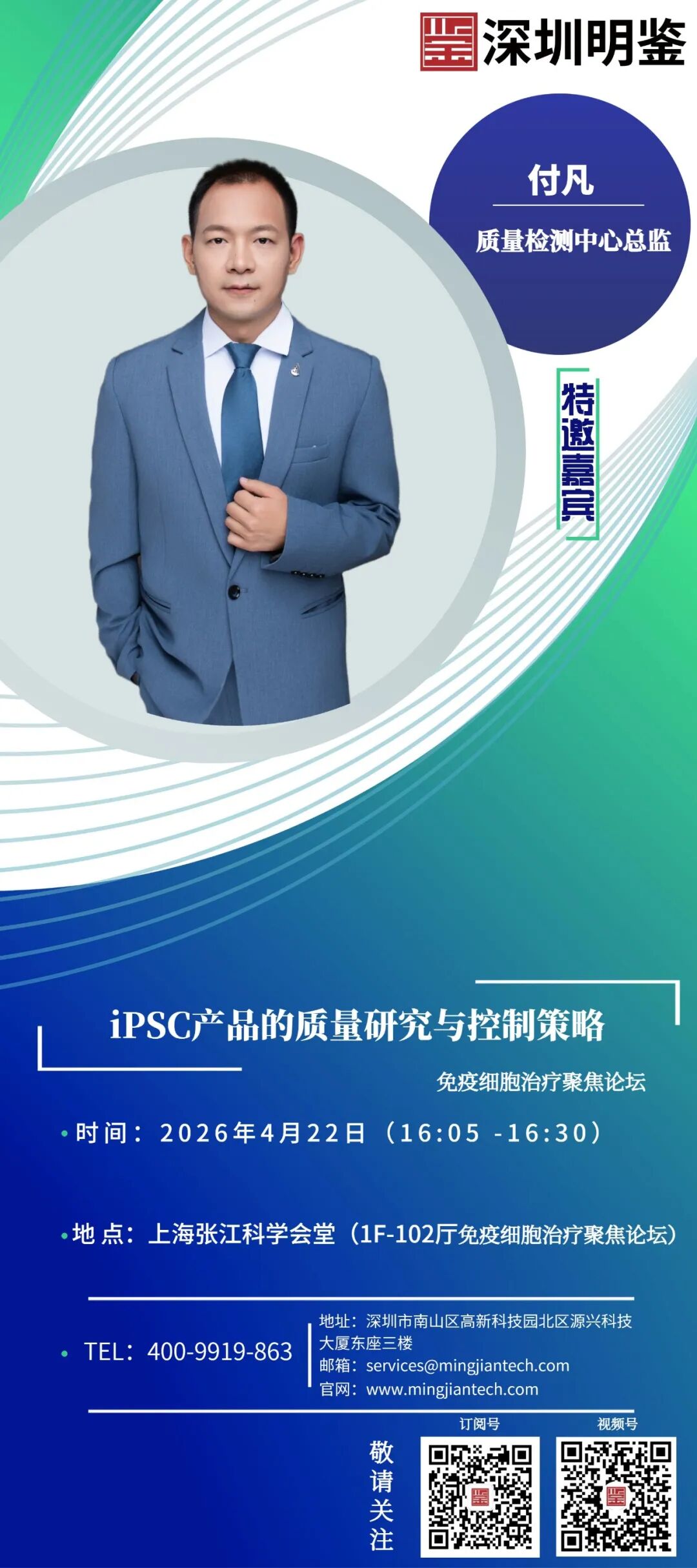 深圳明鉴受邀参加本次论坛,我公司质量检测中心付凡先生将围绕“iPSC产品的质量研究与控制策略”进行主题分享